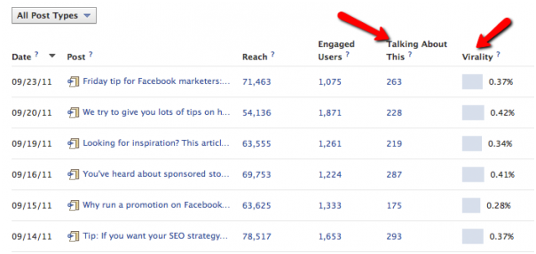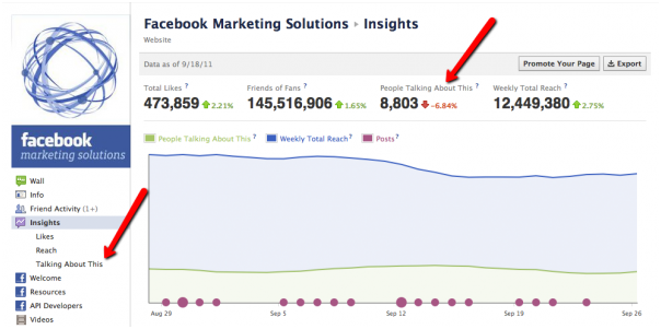 The most noticeable change within Facebook Insights came with the introduction of number of “People Talking About This” metric (seen below your fan count). This is a combination of a various interactions including likes, comments, shares, as well as video plays, RSVPs for events, and check-ins. Now you can see the articles with the most reach, shares and interactions.